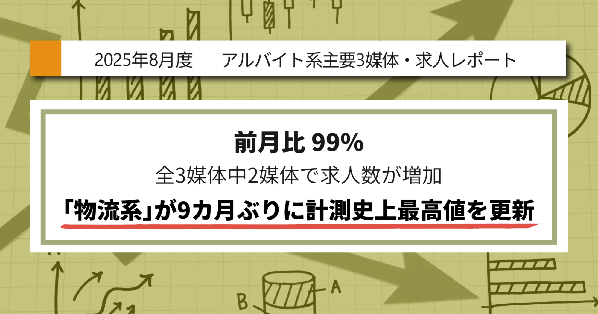 株式会社フロッグが収集している最新の求人媒体掲載情報を活用した「【2025年8月度】アルバイト系主要3媒体・求人レポート」をお届けします。求人市場の動向や各求人媒体・職種の傾向を紐解くのにぜひお役立てください。