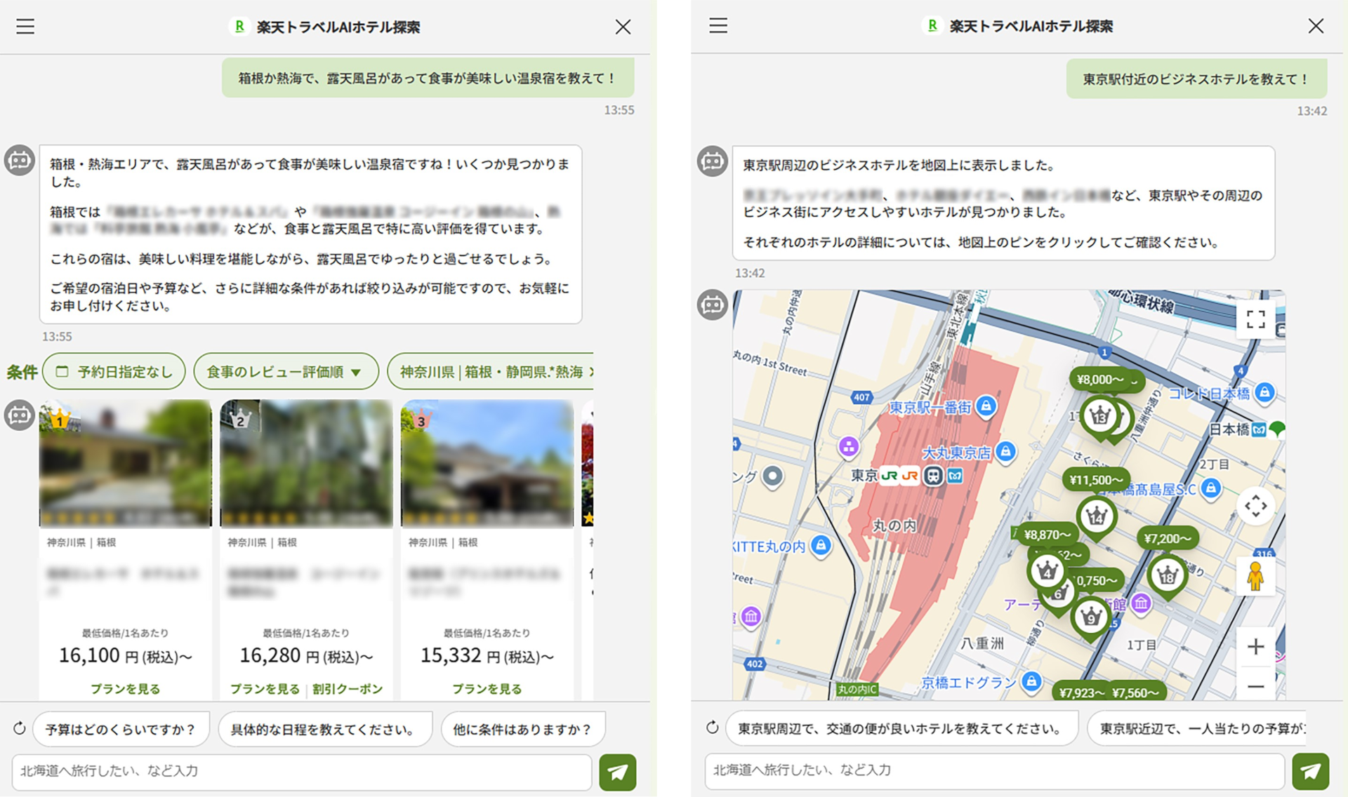 楽天は9月22日、旅行予約サービス「楽天トラベル」のスマートフォンWeb版で、AIと会話しながら最適な宿を探せる「楽天トラベルAIホテル探索」の提供を始めた。 「熱海で、露天風呂があって食事がおいしい宿を教えて」など、自然文の質問を入力すると、AIが候補をピックアップ。宿泊料金やクチコミ評価、おすすめポイント…
