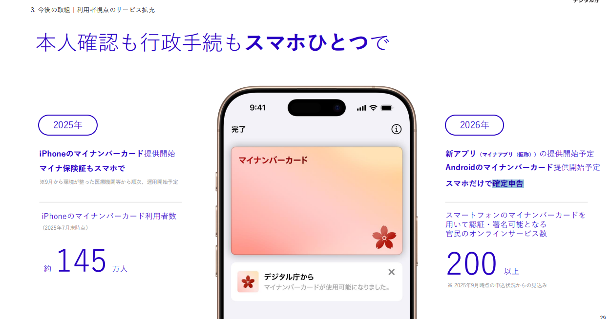 デジタル庁は9月5日、Androidスマートフォンにマイナンバーカードを搭載し、氏名・住所などの属性証明を可能にする機能について、2026年をめどに提供する方針を示した。 iOSについては6月、「Appleウォレット」アプリに情報を登録すれば、マイナカードの電子証明書機能や、属性証明機能を搭載できるサービスの提供を開始…