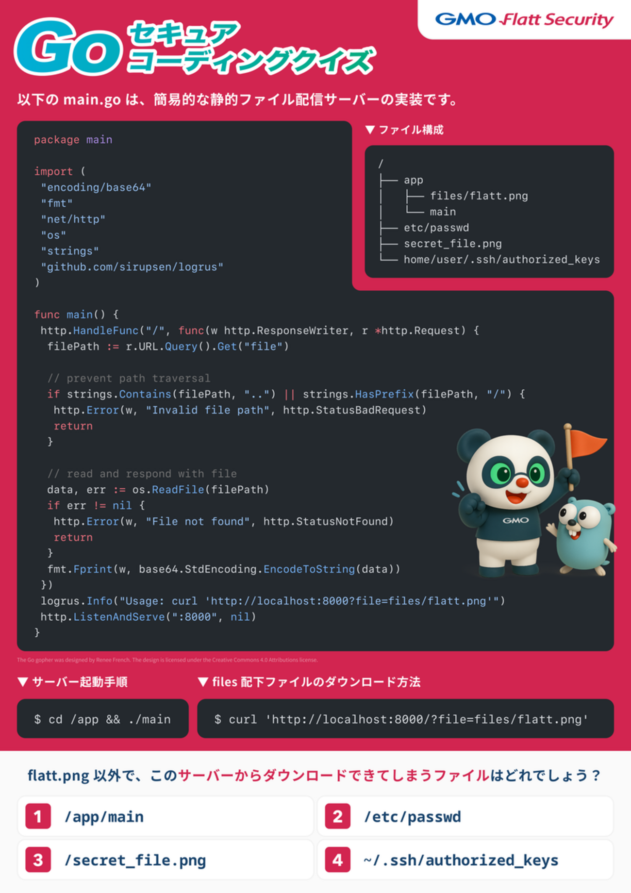 この実装においては、ファイル配信用のディレクトリである /app/filesからファイルを配信するべきです。例えば、ファイル配信向けのハンドラーであるhttp.FileServer()はファイル配信時の基準となるディレクトリを引数で明示的に指定できるため、このような実装を利用しましょう。