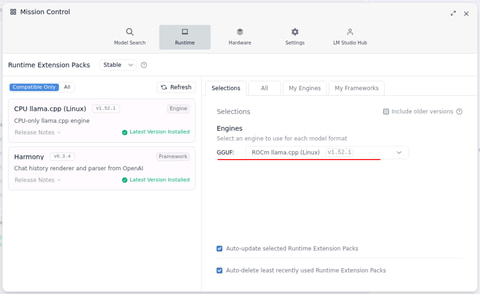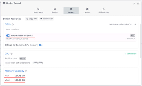 LM Studioの設定/ハードウェア。一応ROCmを認識。RAM 124.45GB、VRAM 128.00GBになっている
