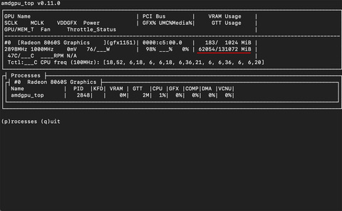 amdgpu_top –smiの実行結果。BIOSでVRAM 64GBとしているので、VRAM 63718MBとなっている