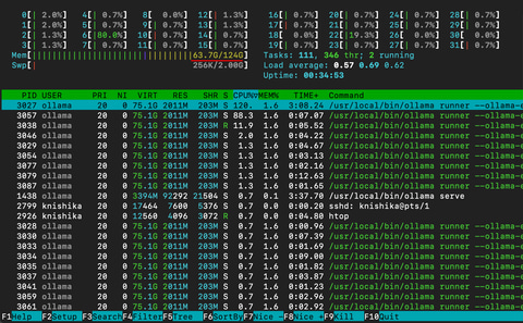 gpt-oss-12b使用中のhtop。RAM 63GBほど使っている