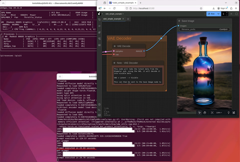 ROCmで作動中のComfyUI。SDXL/832×1,216px/28 steps(23 base + 5 refiner)で29秒
