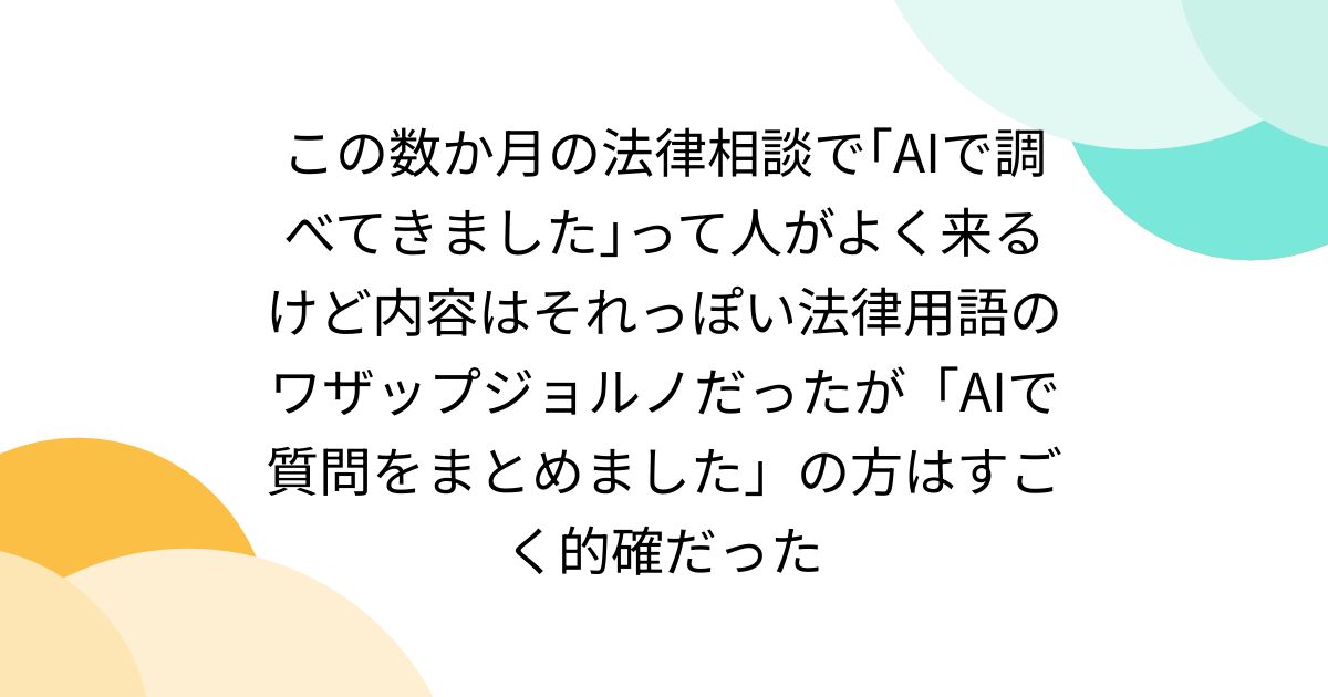 この数か月の法律相談で「AIで調べてきました」って人がよく来るけど内容はそれっぽい法律用語のワザップジョルノだったが「AIで質問をまとめました」の方はすごく的確だった