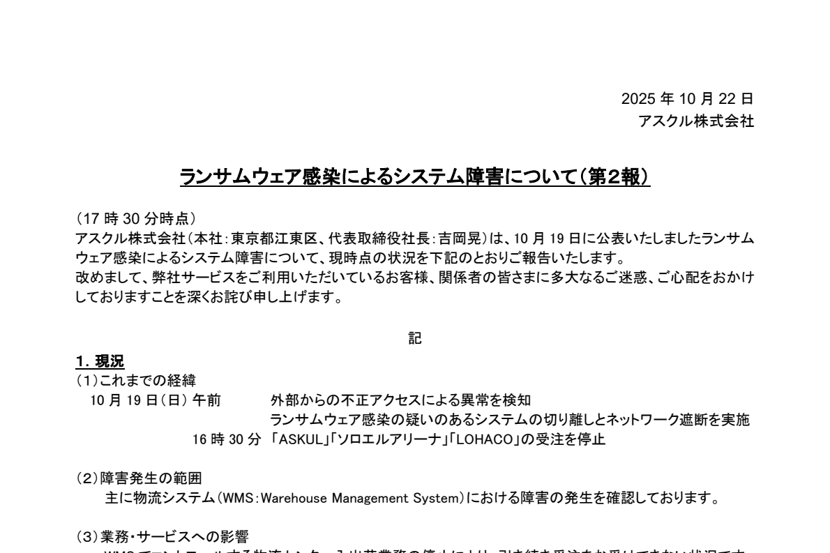 アスクル株式会社は10月22日、ランサムウェア感染によるシステム障害についての第2報を公開した。「ASKUL」「ソロエルアリーナ」「LOHACO」の受注・出荷を停止、ASKUL LOGIST株式会社が受託している物流業務の停止は継続しており、復旧の目途も示されていない。