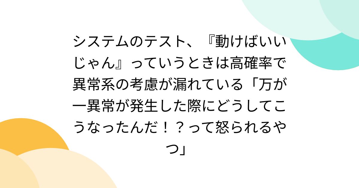 システムのテスト、『動けばいいじゃん』っていうときは高確率で異常系の考慮が漏れている「万が一異常が発生した際にどうしてこうなったんだ!?って怒られるやつ」