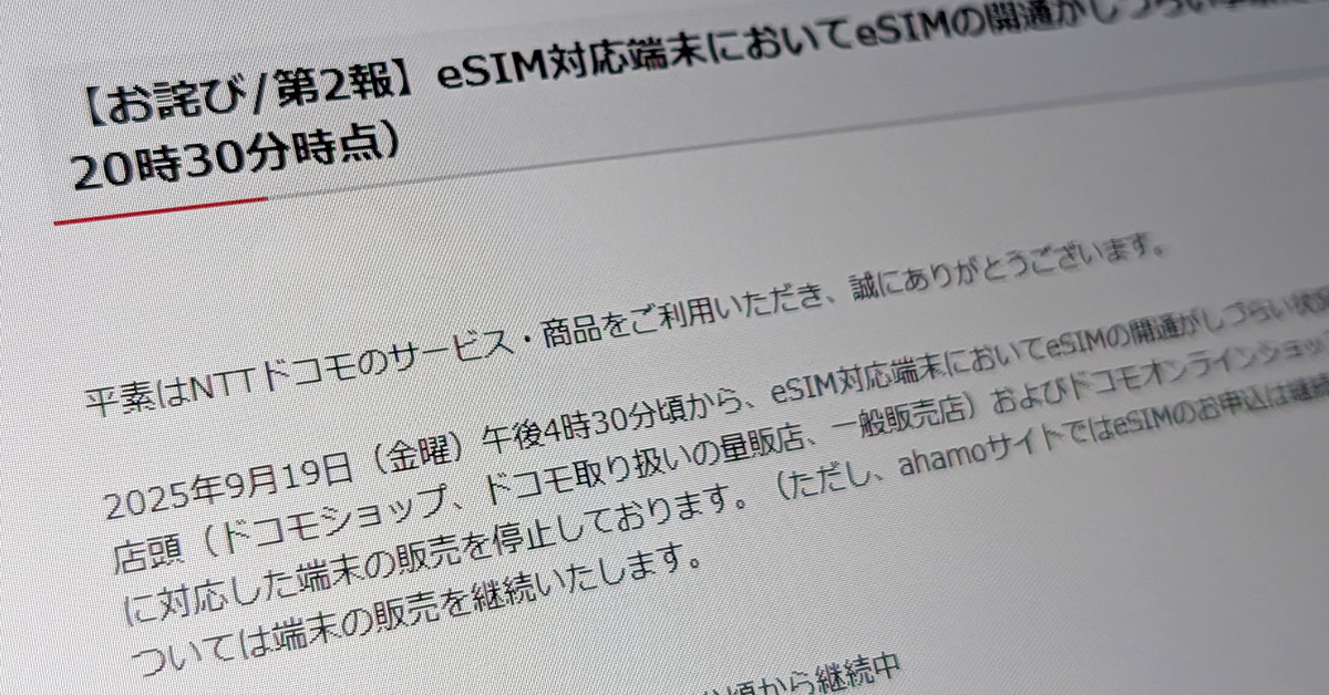 NTTドコモは9月19日、同日午後4時半から発生しているeSIMに関連したトラブルを受け、eSIMの申し込みとeSIMのみに対応した端末の販売を停止するとXの公式アカウントで案内した。19日から販売を開始した「iPhone 17」シリーズと「iPhone Air」はいずれもeSIM専用モデルのため、販売停止の対象とみられる。