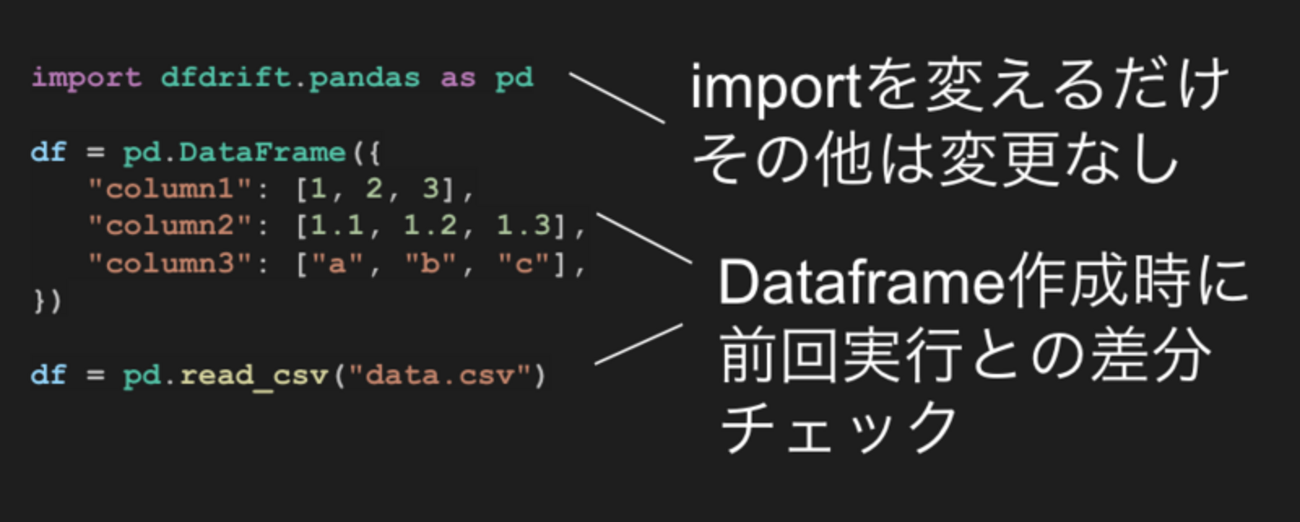 Dataframe(df)の定期実行での誤った変更(drift)を検知するということでdfdriftです。