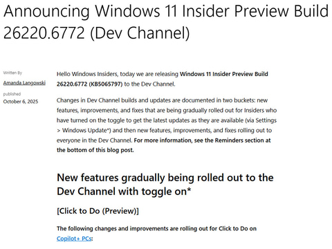 Microsoftは10月6日、Windows 11 Insider Preview「ビルド26120.6772」をBetaチャネル向けに、「ビルド26220.6772」をDevチャネル向けにそれぞれ提供開始した。ローカルアカウントでのセットアップを不可とする変更やダークモードの改善などが順次展開されている。