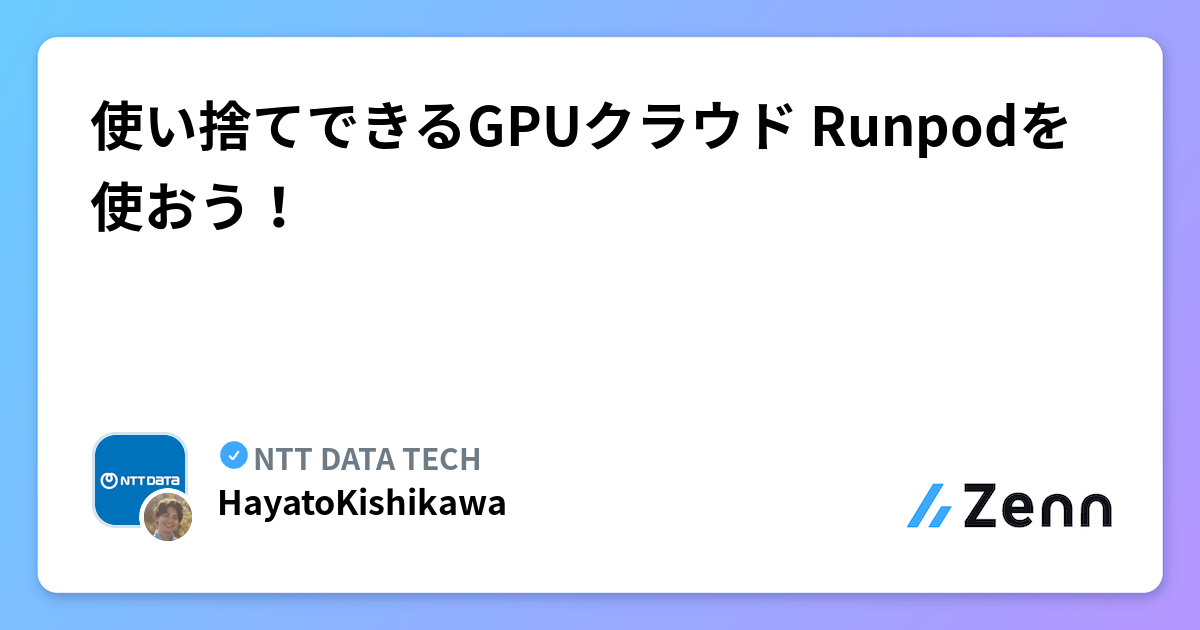 前置きはじめまして!株式会社NTTデータグループの技術革新統括本部AI技術部でSmart AI Agent™のエンジニアをしている岸川です。今回は、GPUクラウドサービス「Runpod」について、実際に研究と仕事で活用してきた経験をもとに紹介します。「ちょっとGPU使いたいだけなのに…」という悩みを持つ方に向けて、Runpodの魅力と具体的な使い方を解説していきます!!免責事項本記事の料金情報は2025年10月時点のものです。最新の料金やサービス内容は、Runpod公式サイトでご確認ください。また、本記事は筆者の個人的な経験に基づく紹介記事です。 はじめに機械学…