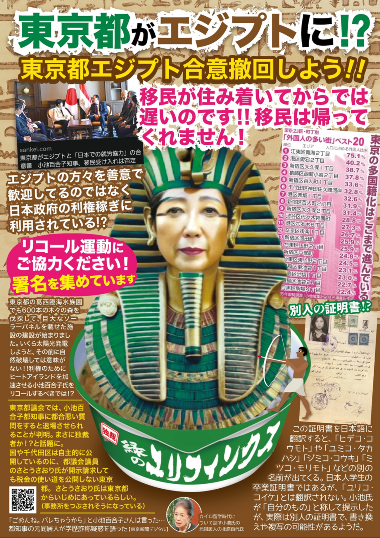少し前から東京都知事の小池百合子に対する辞めろデモ的なものが数回行われている。例えばわかりやすい主張としては次のビラがある。 これの話の「元ネタ」については東京新聞が「デモ発生「東京都は移民を受け入れるのか」…実は誤情報が独り歩き 「元ネタ」エジプトとの合意書の真実は」という記事で書かれているので…