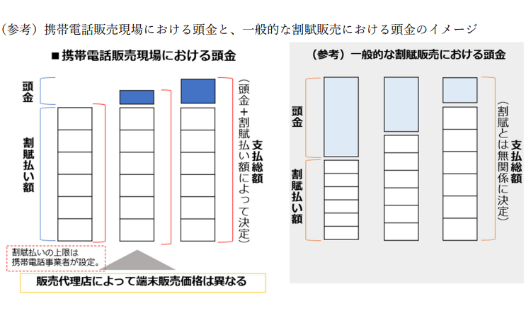 携帯電話販売における「頭金」は、業界特有の商習慣にもとづく用語で、携帯電話事業者のオンライン販売価格に頭金が上乗せされて支払総額とされることが多い。住宅や自動車などの購入における頭金とは意味合いが異なり、端末価格が販売店により異なることを利用者が知らないケースも多く、総務省の調査では、店舗による端末価格の差異を認識している利用者は半数以下だった。