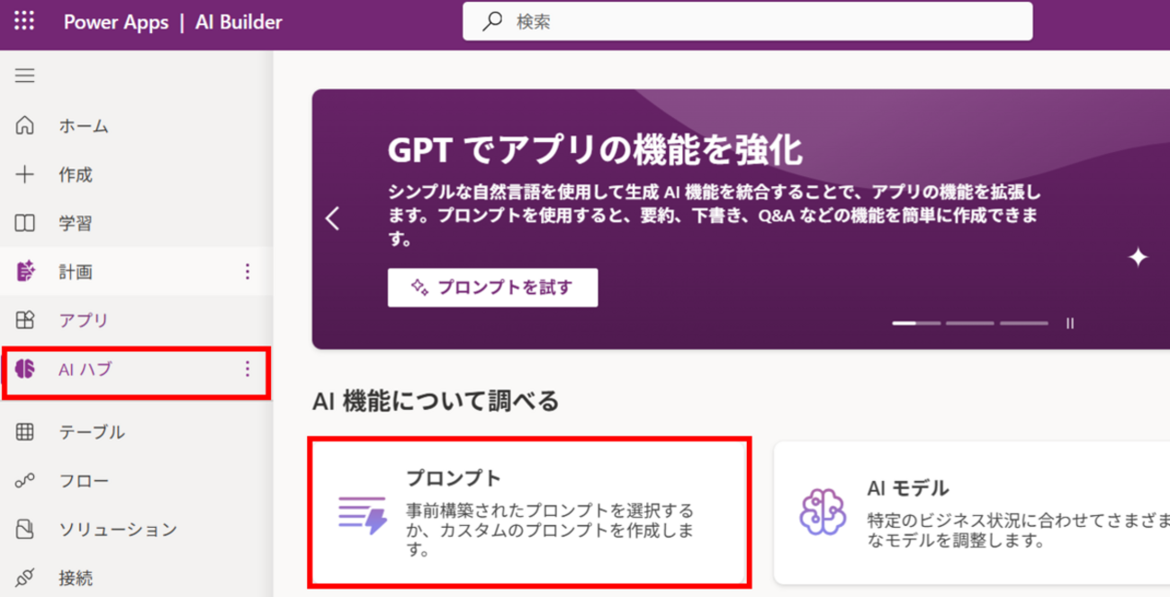 左のナビゲーションバーの「AIハブ」からプロンプトにアクセスすることができます。