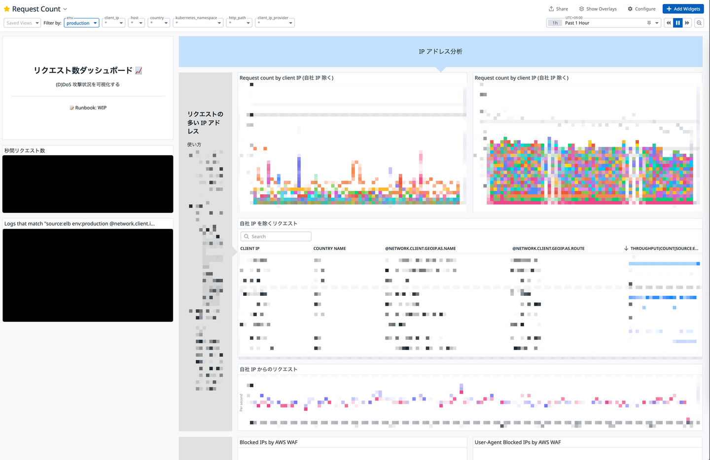 これらの調査にはCloudWatch Logsに記録されるWAFのログや関連情報を集めたDatadog Dashboardを参照します。