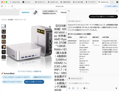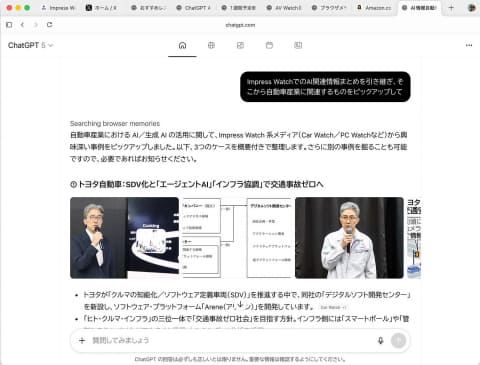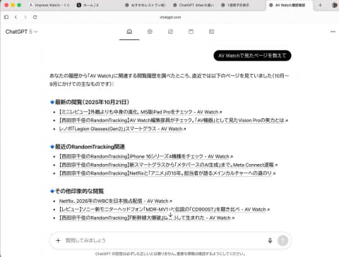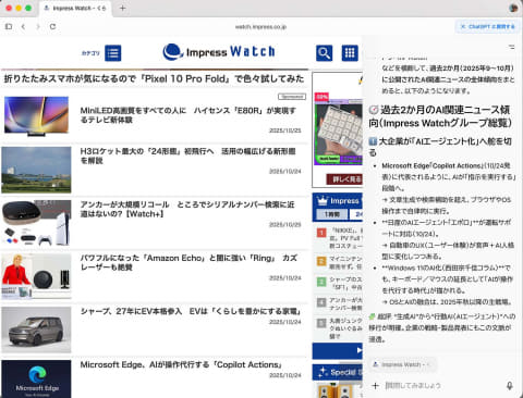 似たことができるAIブラウザーは意外と少ない。EdgeでもCometでも、同じことをやろうとすると不完全な形ではできる。また、サービス自体のメモリー機能の統合は、ChatGPTの方が一歩進んでいる印象を受ける。