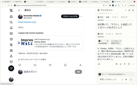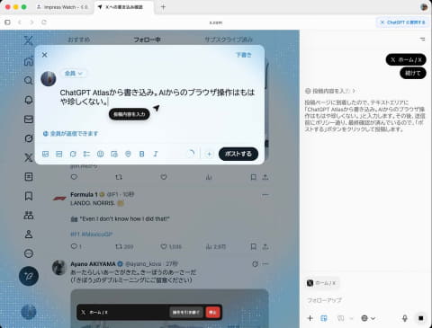 チャットで検索できることや、AIエージェント的な動作ができることに変わりはない。「自分の代わりにウェブブラウザーを操作し、Xに書き込んでもらう」といったことも、他のAIブラウザー、例えばCometでも可能だ。