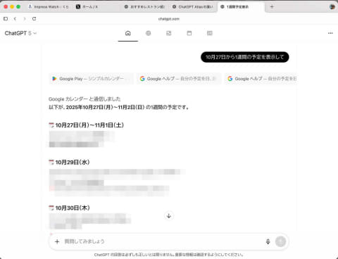 だがChatGPT Atlasの場合、自分がブラウザー上でなにをしていたのか覚えているので、作業中の内容を書き込んで続きをすることもできる。