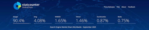 statcounterの調べによる、全世界での2025年9月の検索エンジンシェアでは、Googleが90.4%で圧倒的なシェアを持つ。