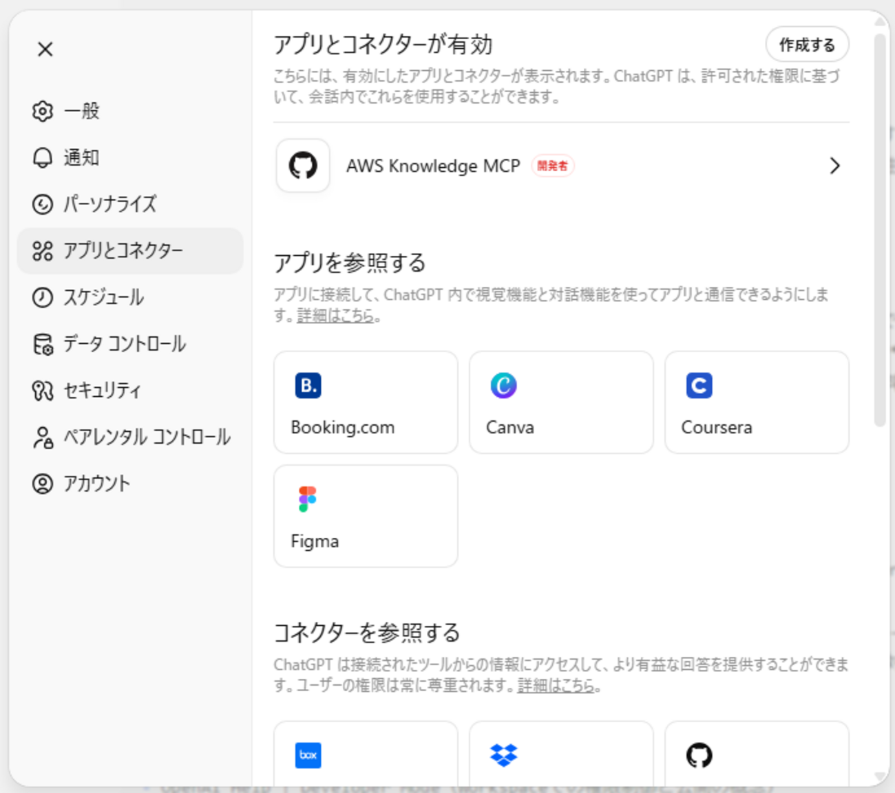 - ChatGPTでは「アプリとコネクター」からこのコネクターを作成して MCP サーバー を利用できます。