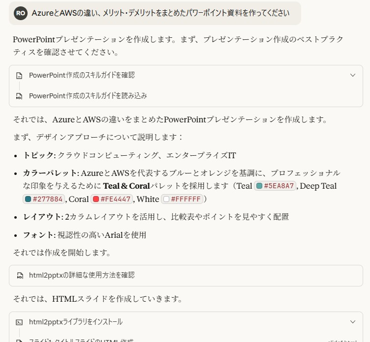 以下のように作成状況を説明しつつ、作業を進めてくれます。