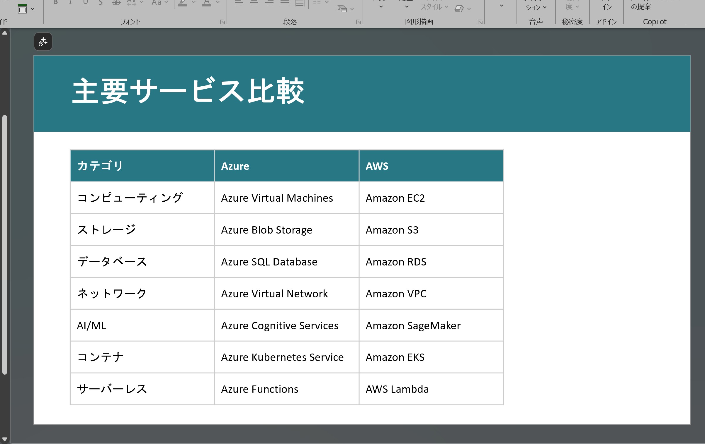 「AzureとAWSの違い、メリット・デメリットをまとめたパワーポイント資料を作ってください」