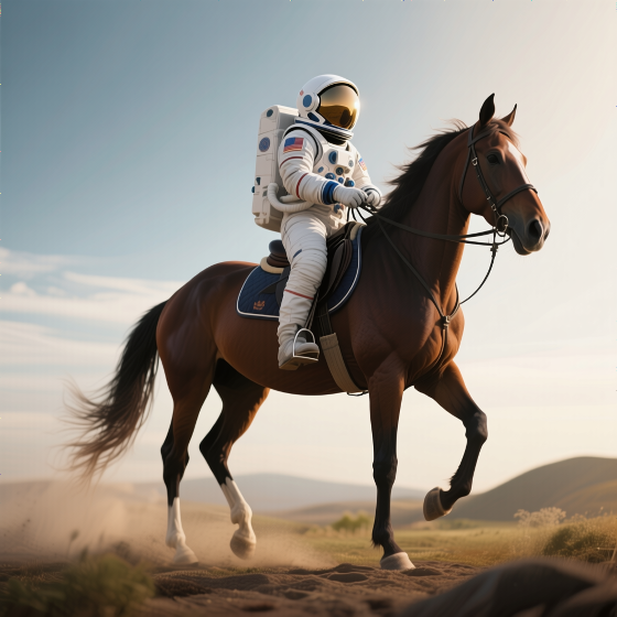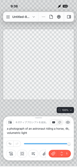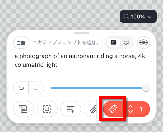 初期状態で「a photograph of an astronaut riding a horse, 4k, volumetric light(馬に乗った宇宙飛行士の写真、4K、ボリュメトリックライト)」というプロンプトが入力されていたので、そのまま赤枠で囲った生成開始ボタンをタップしました。