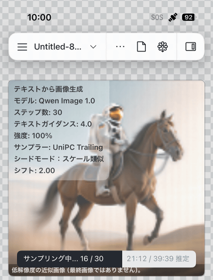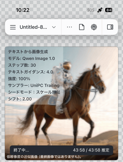 最終的に43分58秒で1枚の画像を生成できました。かなり時間がかかりましたが、特に複雑な設定をせずともiPhoneでQwen Image 1.0を動かせるのは驚異的です。