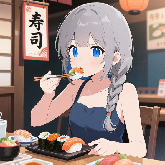 Qwen Image 1.0は「アニメ風の画像」や「漢字やアルファベットを含む画像」の生成も得意としています。そこで、「A girl eating sushi. Braided grey hair. Blue eyes. Japanese anime style. A sign reading “寿司”.(寿司を食べる女の子。グレーの編んだ髪。青い目。日本のアニメ風。『寿司』と書かれた看板)」というプロンプトでも生成してみました。