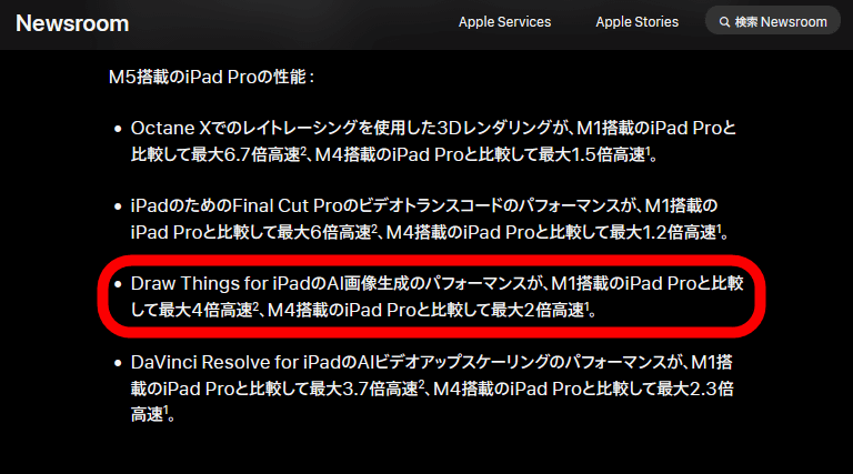 Draw ThingsはStable Diffusionの登場で画像生成AIに対する注目が一気に高まった2022年に開発されたアプリです。GIGAZINEでも登場初期にレビュー済みなのですが、3年弱の間にmacOSに対応したりControlNetが利用可能になったりLoRAの学習に対応したりといったアップデートで施されてもはや別物の高機能アプリへと成長しました。AppleがM5搭載iPad Proを発表した際にはFinal Cut ProやDaVinci Resolveといった超有名アプリと並んで性能アピールに使われており、Appleも認めるほどのアプリとなったことが分かります。
