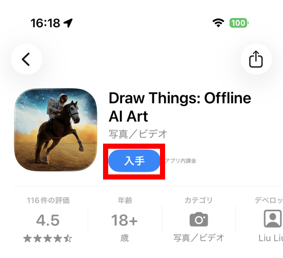 App StoreでDraw Thingsの配布ページを開いて「入手」をタップ。