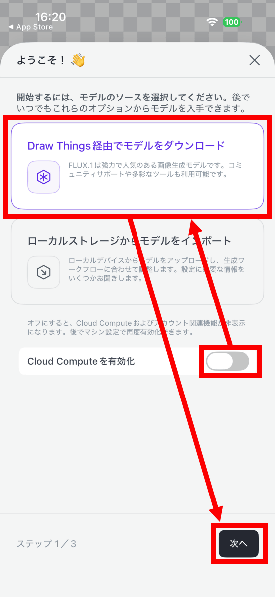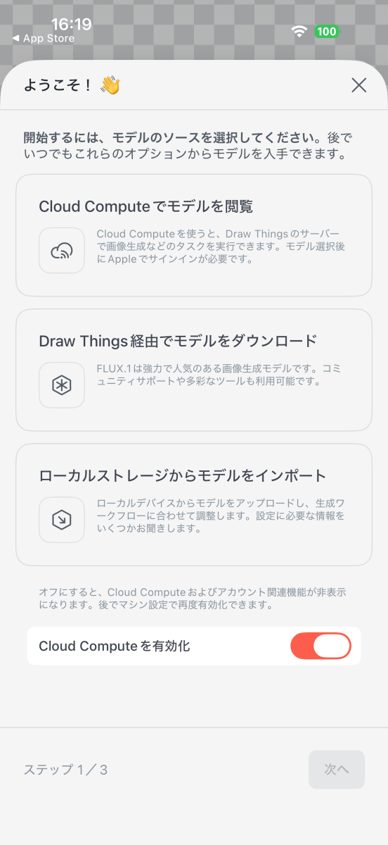 今回はiPhoneのローカル生成能力を確かめたいので、「Cloud Computeを有効化」のトグルスイッチをOFFに切り替え、「Draw Things経由でモデルをダウンロード」をタップしてから「次へ」をタップしました。