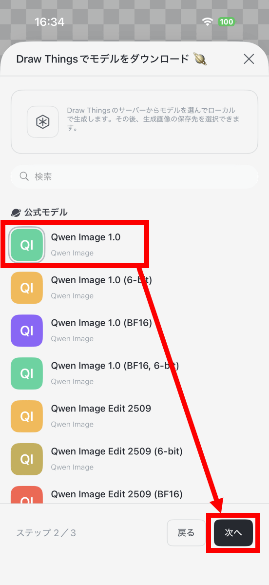 続いて、モデル選択画面が表示されます。モデルは「Qwen Image」「Stable Diffusion XL」「HiDream」「FLUX」など数多くの種類が用意されています。今回は「Qwen Image 1.0」を選択して「次へ」をタップしました。