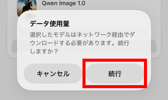画像生成用のAIモデルはファイルサイズが非常に大きいので、データ使用量の警告が表示されます。問題がないことを確認してから「続行」をタップ。