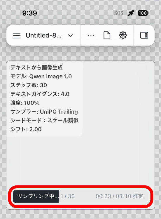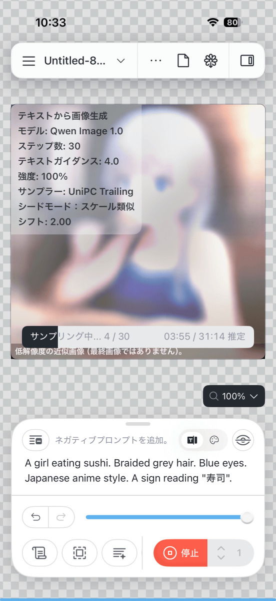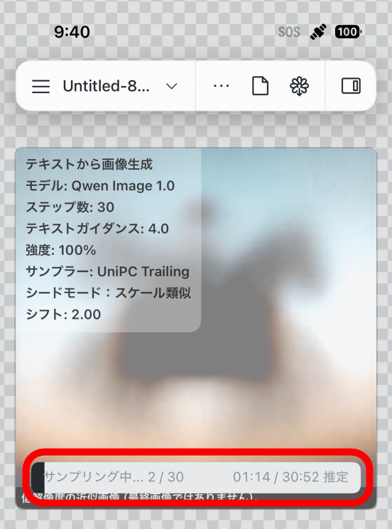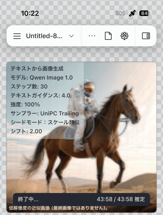 最終的に43分58秒で1枚の画像を生成できました。かなり時間がかかりましたが、特に複雑な設定をせずともiPhoneでQwen Image 1.0を動かせるのは驚異的です。