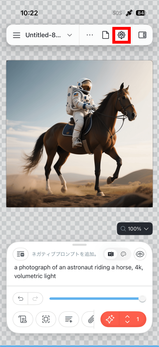 初期状態で「a photograph of an astronaut riding a horse, 4k, volumetric light(馬に乗った宇宙飛行士の写真、4K、ボリュメトリックライト)」というプロンプトが入力されていたので、そのまま赤枠で囲った生成開始ボタンをタップしました。