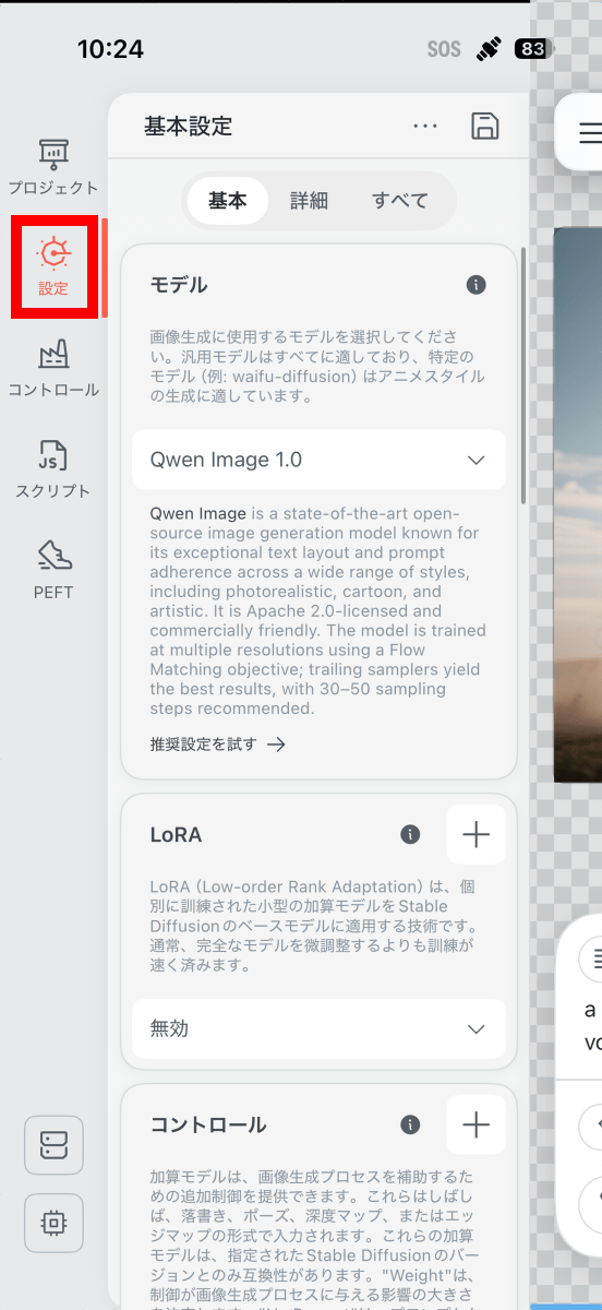 画面左側のメニュー内にある「設定」をタップすると、モデルやLoRAを指定できます。