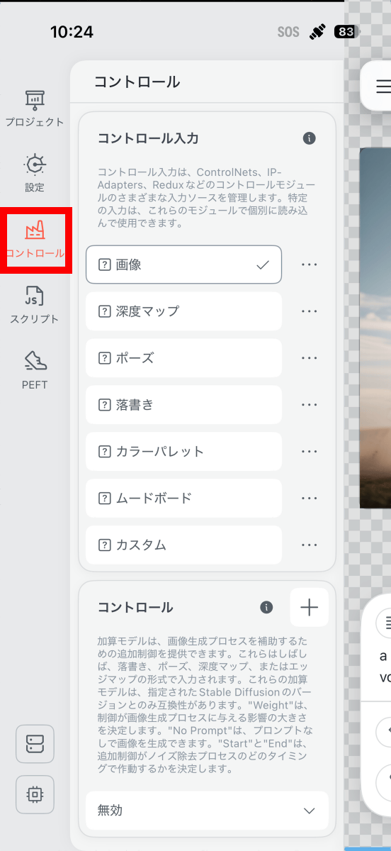 また、「コントロール」をタップするとコントロール入力画面が開きます。この画面では、ControlNetを活用して深度マップやポーズの指定といった高度な操作が可能です。