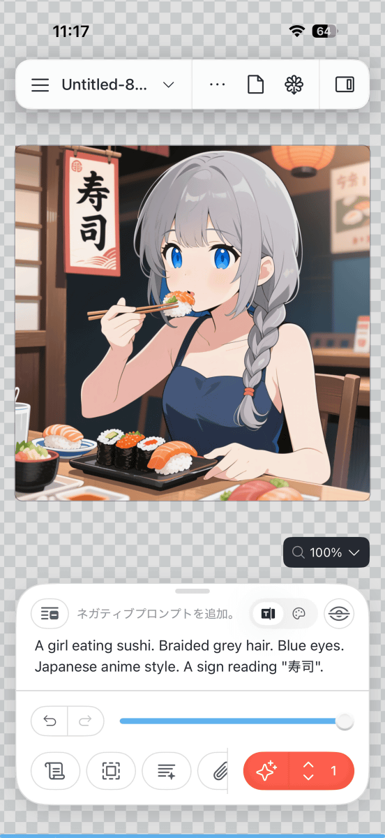 Qwen Image 1.0は「アニメ風の画像」や「漢字やアルファベットを含む画像」の生成も得意としています。そこで、「A girl eating sushi. Braided grey hair. Blue eyes. Japanese anime style. A sign reading “寿司”.(寿司を食べる女の子。グレーの編んだ髪。青い目。日本のアニメ風。『寿司』と書かれた看板)」というプロンプトでも生成してみました。