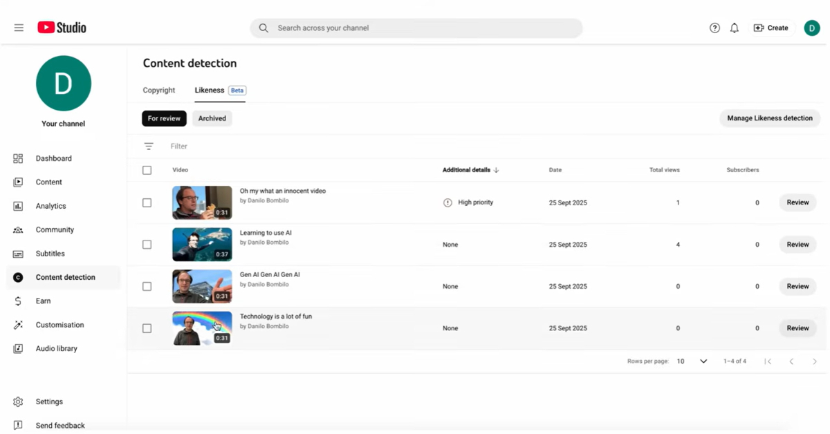 ツールにアクセスすると、YouTube上で公開されている自分の顔が使われている可能性のある動画を確認でき、これらの動画がシステムによって「より高い優先度」と識別されたかどうかも判別できる。 一致が検出された場合、クリエイターは、YouTubeのプライバシーガイドラインに従って削除をリクエストするか、著作権リクエ…